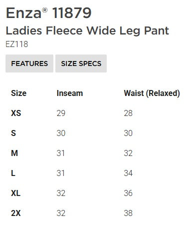 Printed on a pair of Enza brand ladies wide leg fleece sweatpants.